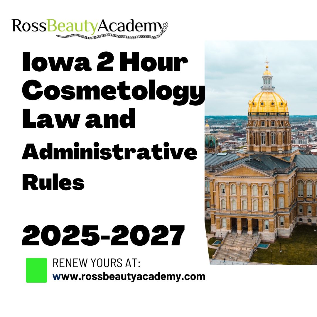 This course is designed for licensed cosmetologists, estheticians, nail technicians, and beauty professionals in Iowa who need to complete their 2-hour Law & Administrative Rules Continuing Education requirement for license renewal.